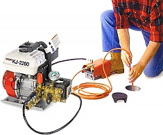 - Двухпозиционное управление ножной педалью пуска обеспечивает полный контроль размывающего действия струи в устье сточной трубы