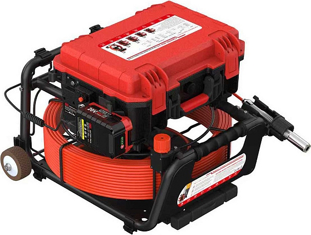- Головка камеры Ø 21 × 45 мм и проталкиваемый кабель Ø 5,3 мм × 40 м из стекловолокна со счетчиком длины и системой торможения, подходящие для труб Ø 50 – 125 мм, длиной до 40 м
